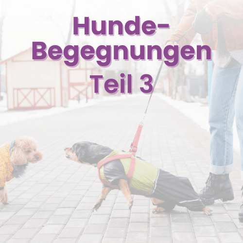 Im dritten Teil schauen wir uns an, wie du Hundebegegnungen im Nahkontakt trainieren kannst. Im Webinar schauen wir uns zuerst an, wie es ausschaut. Dann schauen wir uns an, welche Signale du mit dem jeweiligen Hund aufbauen kannst, damit Nahkontakte entspannt ablaufen.